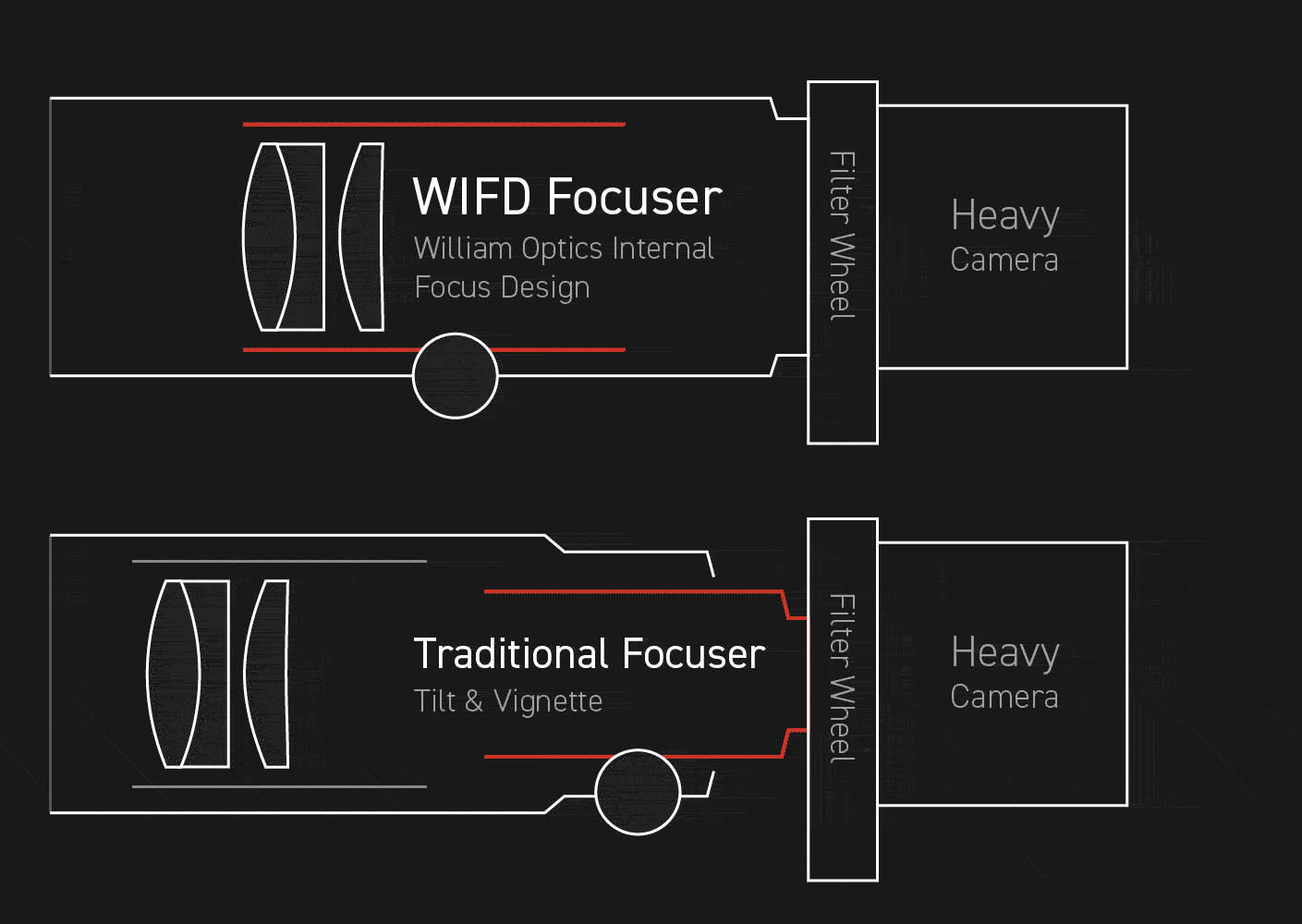The WIFD focusing Design relocates the focuser to the center of the telescope, addresses the issue of tube tilt caused by the weight of accessories and cameras.